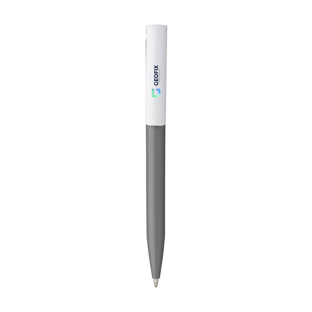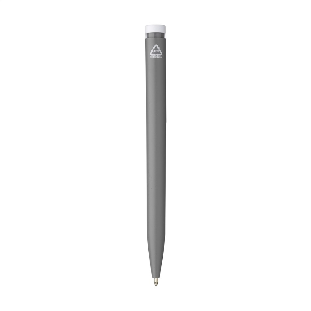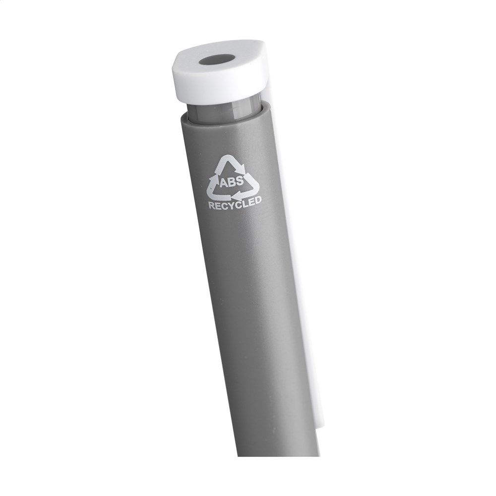 Blauwschrijvende balpen met houder gemaakt van 100% gerecycled ABS. De clip/drukknop heeft een opvallend kleuraccent en biedt ruimte voor een royale digitale full colour opdruk. GRS-gecertificeerd.