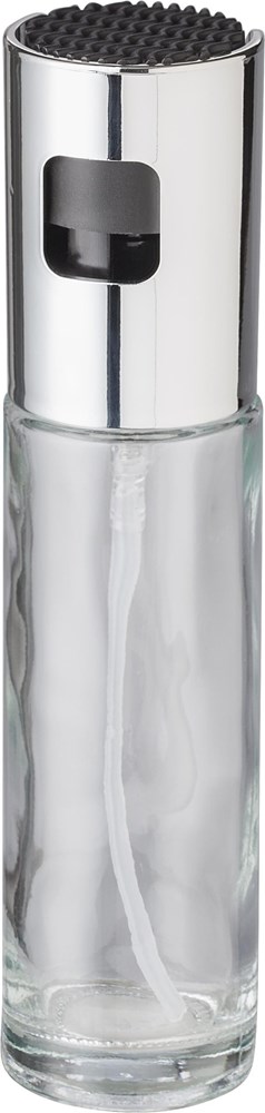 Glazen oliespraydispenser (100 ml). Met roestvrijstalen deksel. Verpakt per stuk in bruin kartonnen doos.