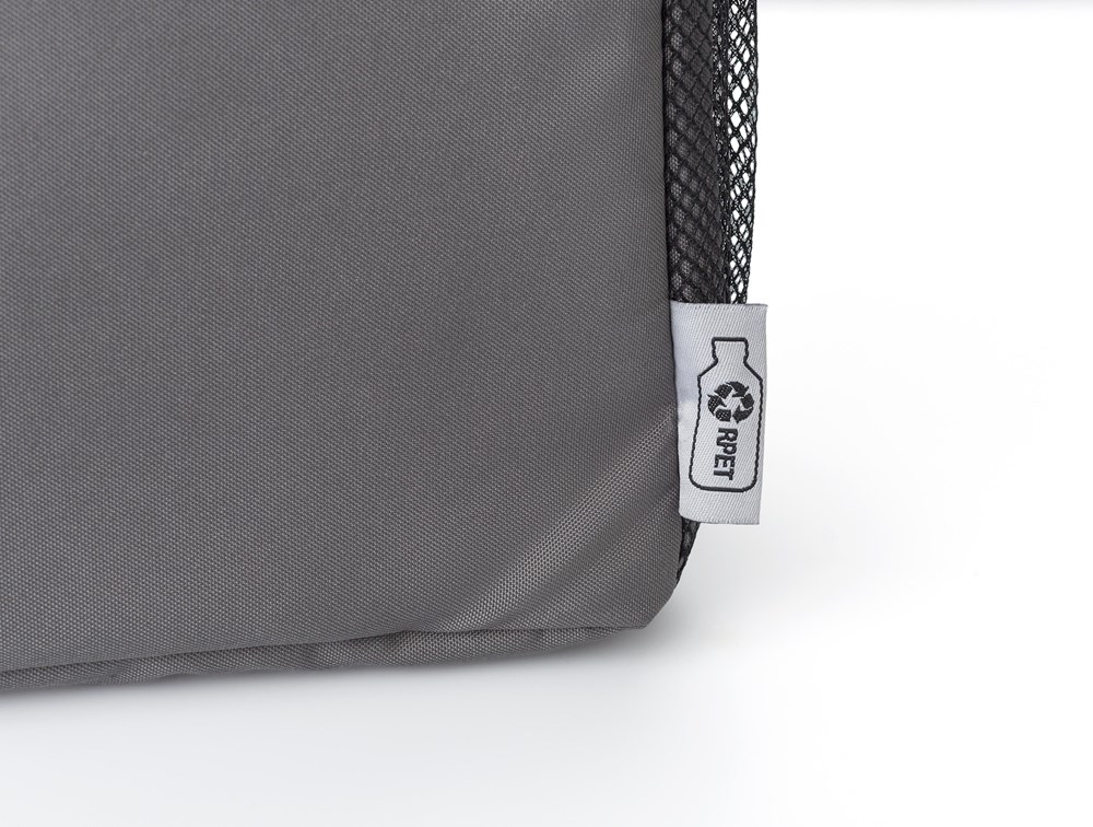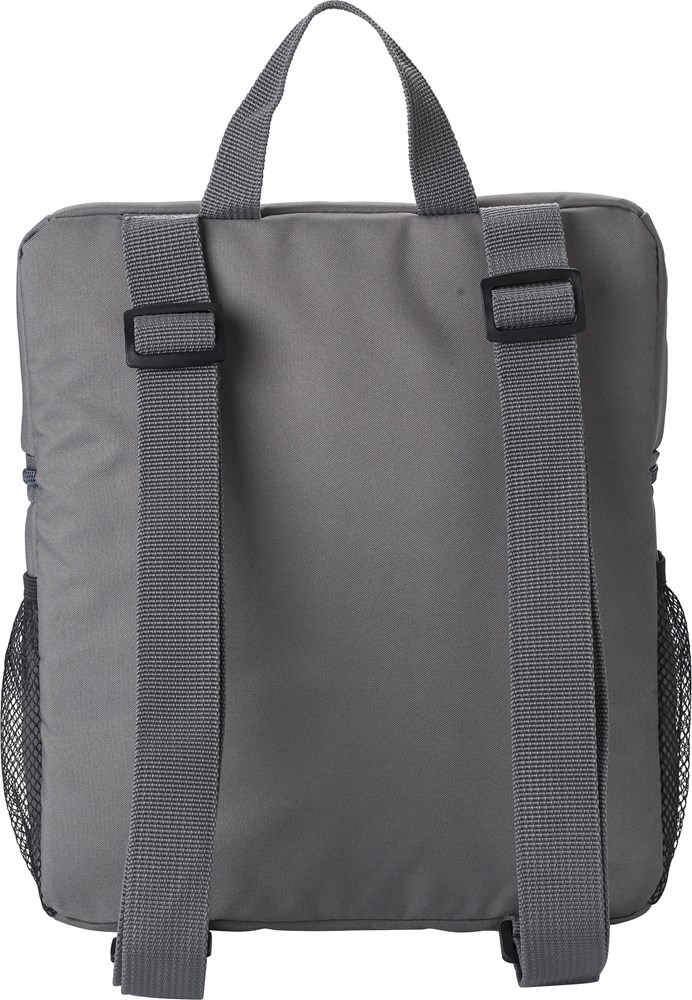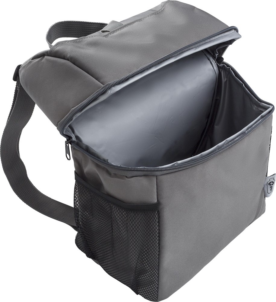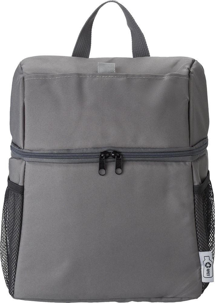Gerecyclede polyester (300D/PU rPET) koelrugzak met PEVA (13C) voering. Eén voorvak met klittenbandsluiting, twee gaasvakken aan de zijkant. Verstelbare draagriem.