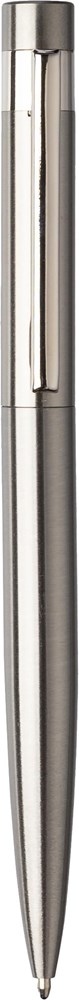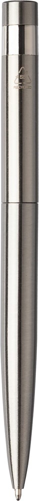 Gerecycled roestvrijstalen draaibalpen, inclusief een gerecycled roestvrijstalen logo op de achterkant, met blauwe inkt. Individueel verpakt in een kraftpapieren geschenkverpakking.