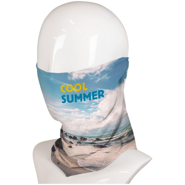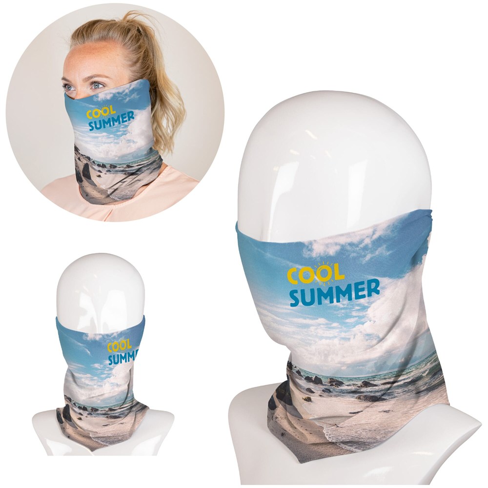 Draag deze multifunctionele sjaal als gezichtsmasker om jezelf of mensen om je heen te beschermen, draag hem als bandana of gewoon als muts. De keuze is aan jou. Deze multifunctionele sjaal kan all over bedrukt worden met sublimatie. Bedrukking van de achterkant is optioneel. De kleur van het basismateriaal is wit. Wassen voor gebruik.