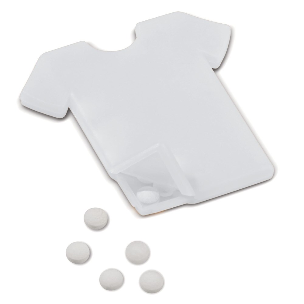Pepermuntdoosje in de vorm van een T-shirt. Opening van het doosje aan de onderkant van het T-shirt. Inhoud: circa zeven gram suikervrije pepermuntjes. Geschikt voor full-colour digitaal druk.