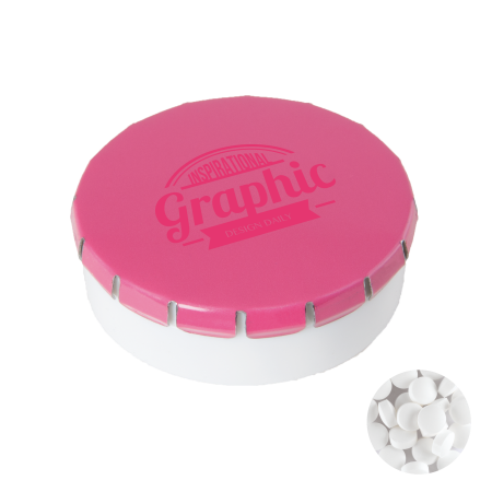 Super Click Clack Ø 45 mm x 15 mm., met ca. 12 gr. suikervrije mintjes. witte bodem van gerecycled PP met seal en metalen deksel, beschikbaar in een groot scala aan kleuren.