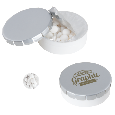 Super Click Clack Ø 45 mm x 15 mm., met ca. 12 gr. suikervrije mintjes. witte bodem van gerecycled PP met seal en metalen deksel, beschikbaar in een groot scala aan kleuren.