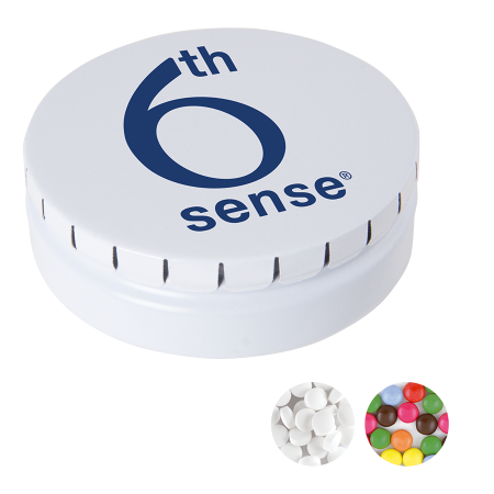 Rond click clack blik Ø 75 mm x 23,5 mm., standaard gevuld met DutchDex dextrose mints (made in Holland).