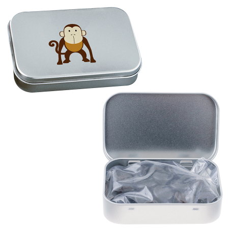 Scharnierblik 95 x 60 x 21 mm. met ca. 60 gr. munt drop