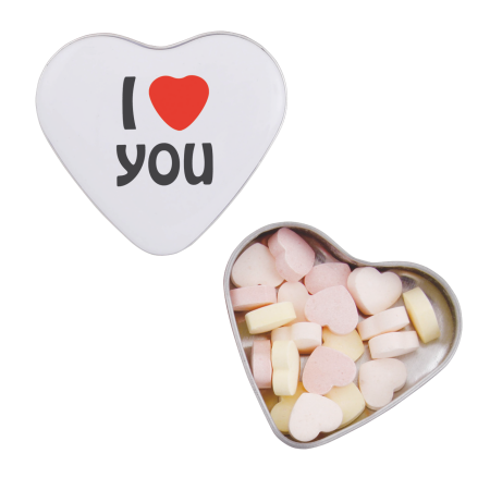 Hart blik 70 x 65 x 15 mm., verkrijgbaar in 4 kleuren. Standaard gevuld met vruchtenhartjes (made in Holland).