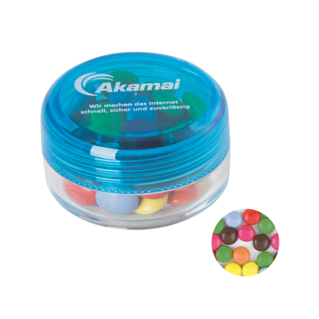 Kunststof rond potje ø45 x 25 mm. met gekleurd deksel en ca. 12 gr. chococarletties