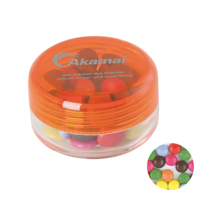 Kunststof rond potje ø45 x 25 mm. met gekleurd deksel en ca. 12 gr. chococarletties