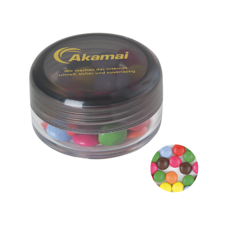 Kunststof rond potje ø45 x 25 mm. met gekleurd deksel en ca. 12 gr. chococarletties