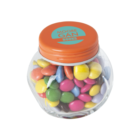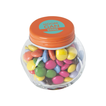 Kleine glazen pot gevuld met ca. 40 gr. choco carletties gekleurd deksel, 53 x 35 x 55 mm., met bedrukking op deksel