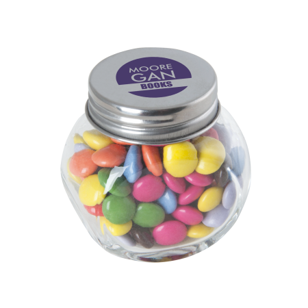 Kleine glazen pot gevuld met ca. 40 gr. choco carletties gekleurd deksel, 53 x 35 x 55 mm., met bedrukking op deksel