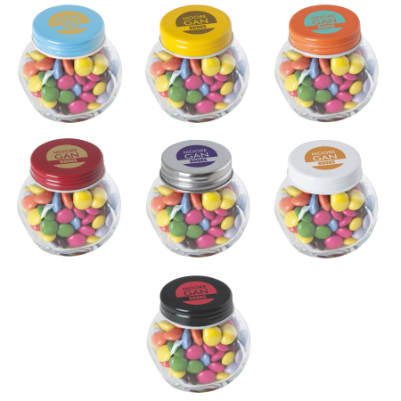 Kleine glazen pot gevuld met ca. 40 gr. choco carletties gekleurd deksel, 53 x 35 x 55 mm., met bedrukking op deksel