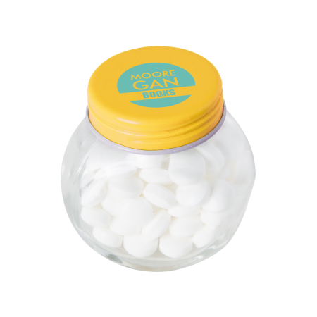 Kleine glazen pot met verschillende kleuren deksel, 53 x 35 x 55 mm., gevuld met ca. 40 gr. DutchDex dextrose mints. Gekleurd deksel.