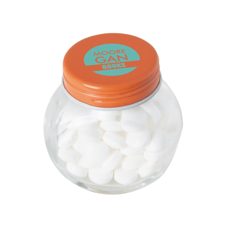 Kleine glazen pot met verschillende kleuren deksel, 53 x 35 x 55 mm., gevuld met ca. 40 gr. DutchDex dextrose mints. Gekleurd deksel.
