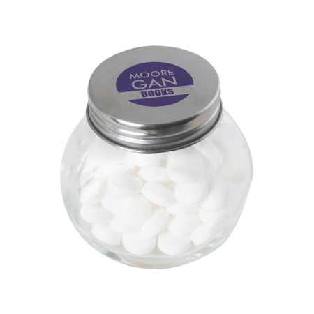 Kleine glazen pot gevuld met ca. 40 gr. mints gekleurd deksel
