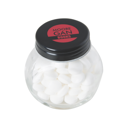 Kleine glazen pot met verschillende kleuren deksel, 53 x 35 x 55 mm., gevuld met ca. 40 gr. DutchDex dextrose mints. Gekleurd deksel.