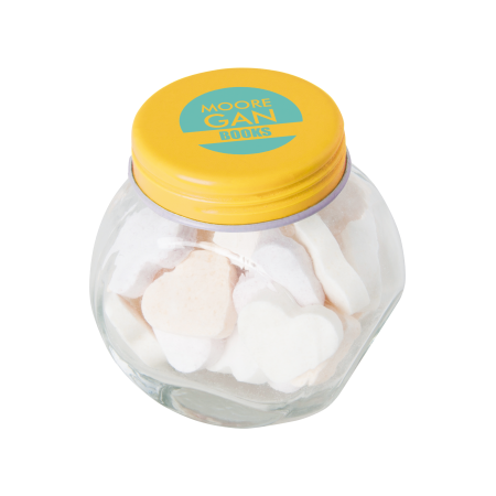 Kleine glazen pot gevuld met ca. 40 gr. vruchten hartjes gekleurd deksel, 53 x 35 x 55 mm., met bedrukking op het dekseltje