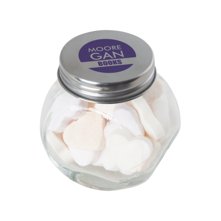 Kleine glazen pot gevuld met ca. 40 gr. vruchten hartjes gekleurd deksel, 53 x 35 x 55 mm., met bedrukking op het dekseltje