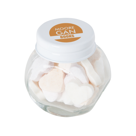 Kleine glazen pot gevuld met ca. 40 gr. vruchten hartjes gekleurd deksel, 53 x 35 x 55 mm., met bedrukking op het dekseltje