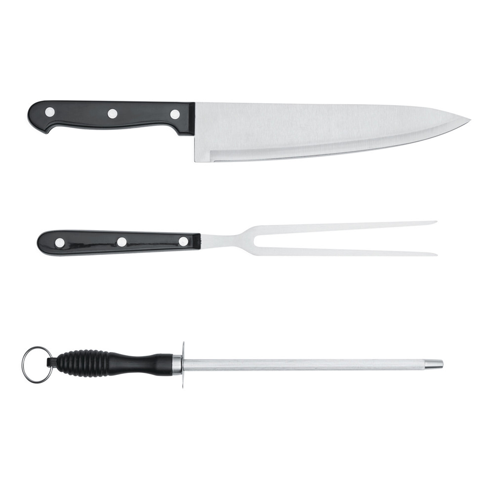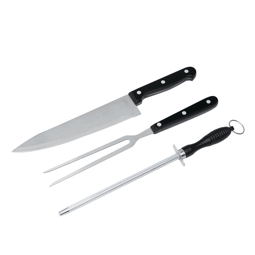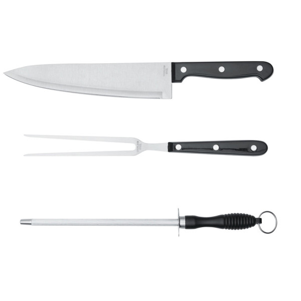 3-delig trancheerbestek CARVE van roestvrij staal bestaande uit een aanzetmes met ophangoog, vleesmes en vleesvork. Geleverd in Geleverd in geschenkdoos.