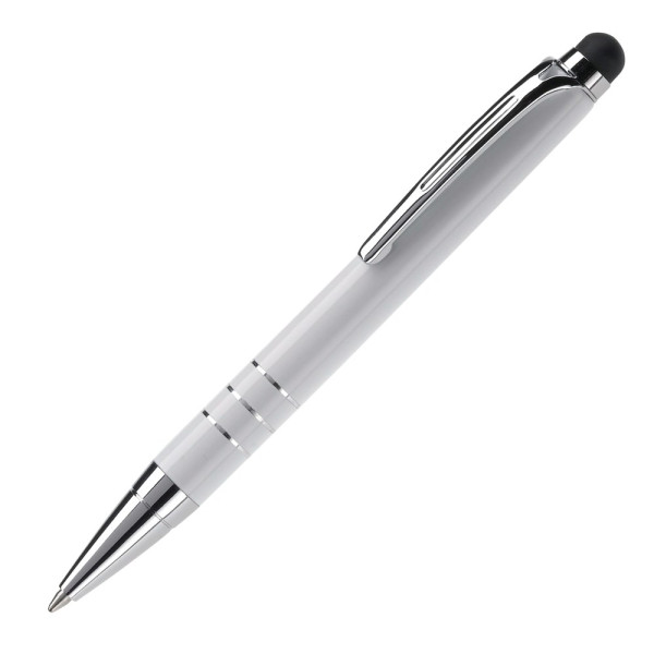 Kleine, aluminium balpen met touchscreen bovenkant. Pen is voorzien van draaimechanisme.