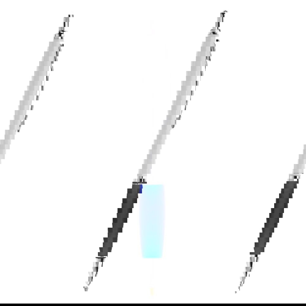 Witte balpen met metalen clip en metal look drukknop, ring en punt. De pen bevat een blauwschrijvende Jumbo vulling.