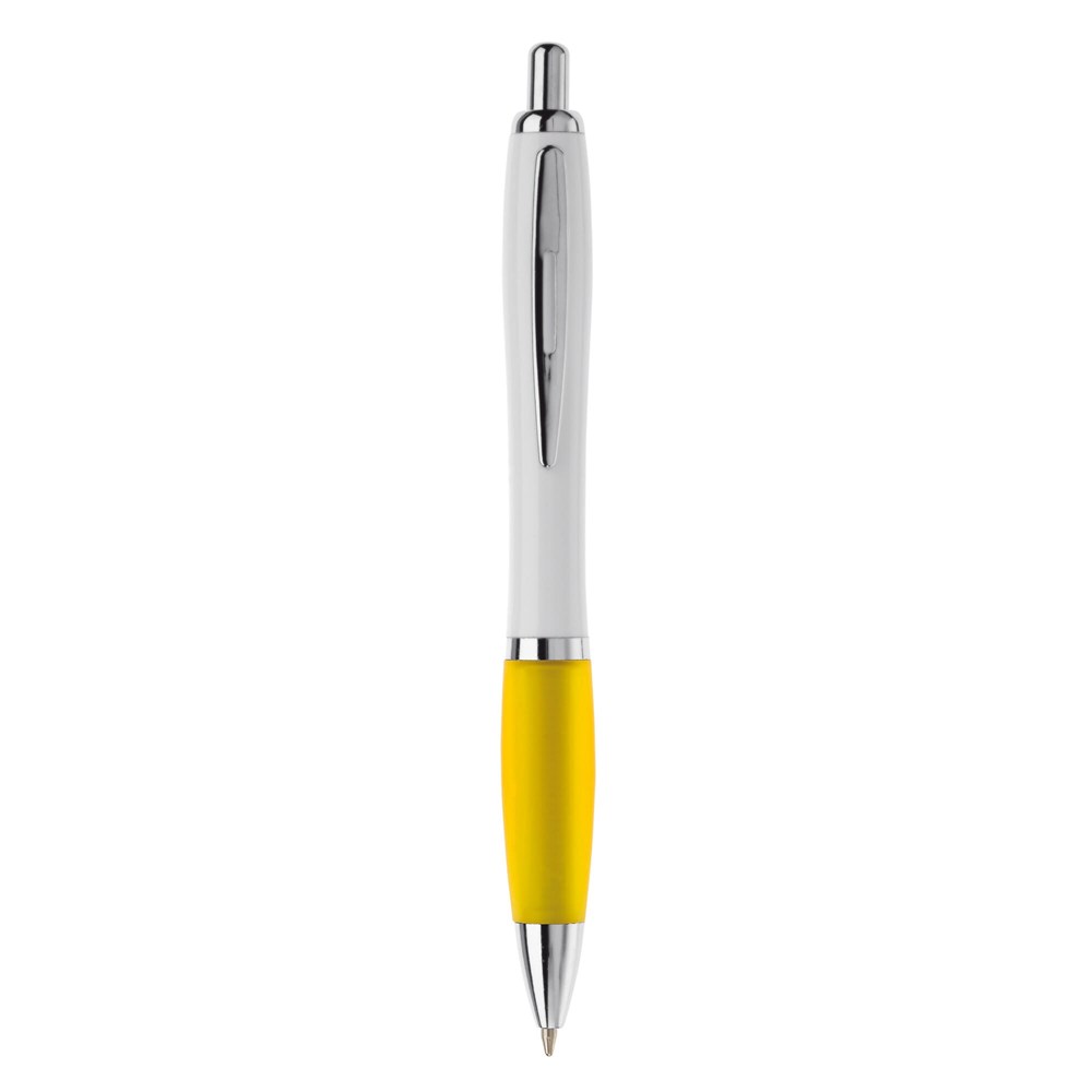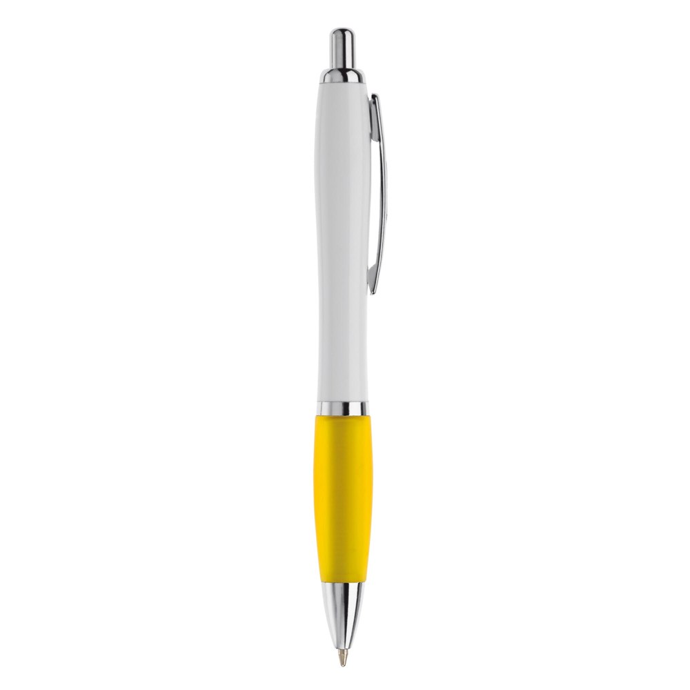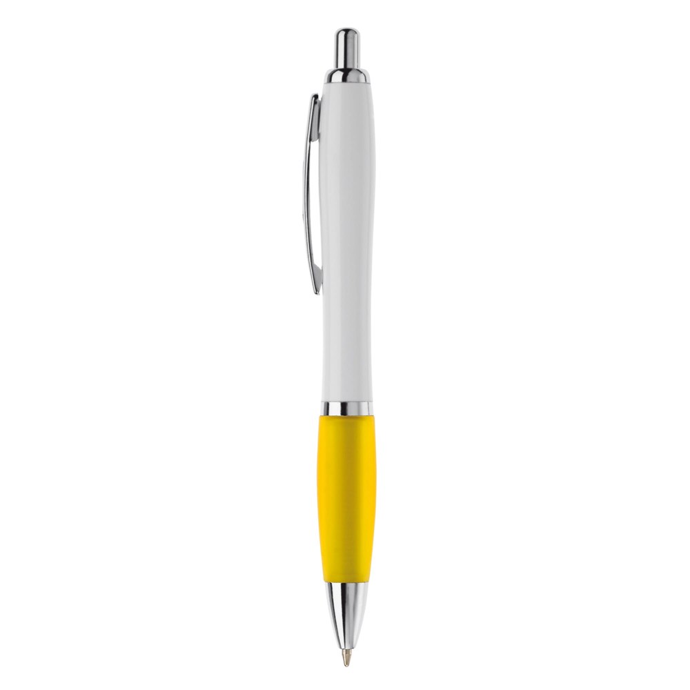 Witte balpen met metalen clip en metal look drukknop, ring en punt. De pen bevat een...meer