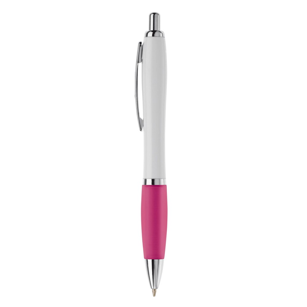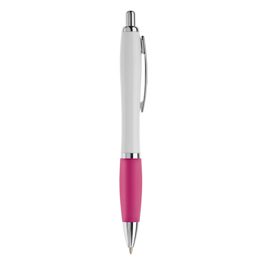 Witte balpen met metalen clip en metal look drukknop, ring en punt. De pen bevat een blauwschrijvende Jumbo vulling.