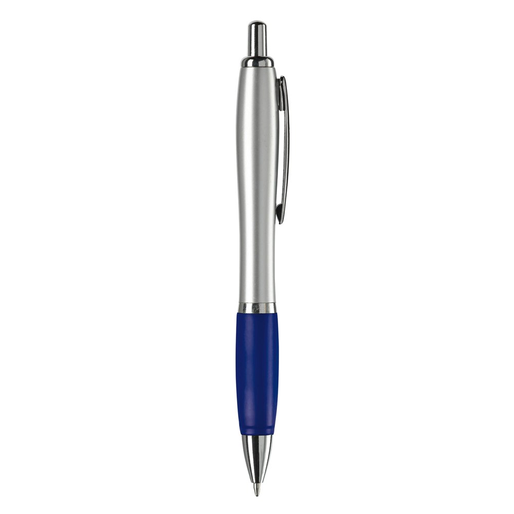 Zilveren balpen met metalen clip, gekleurde grip en een 'metal-look' drukknop, ring en punt. De pen bevat een blauwschrijvende Jumbo vulling.