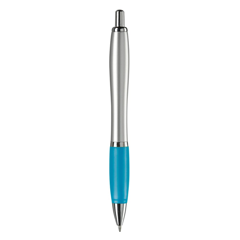Zilveren balpen met metalen clip, gekleurde grip en een 'metal-look' drukknop, ring en punt. De pen bevat een blauwschrijvende Jumbo vulling.