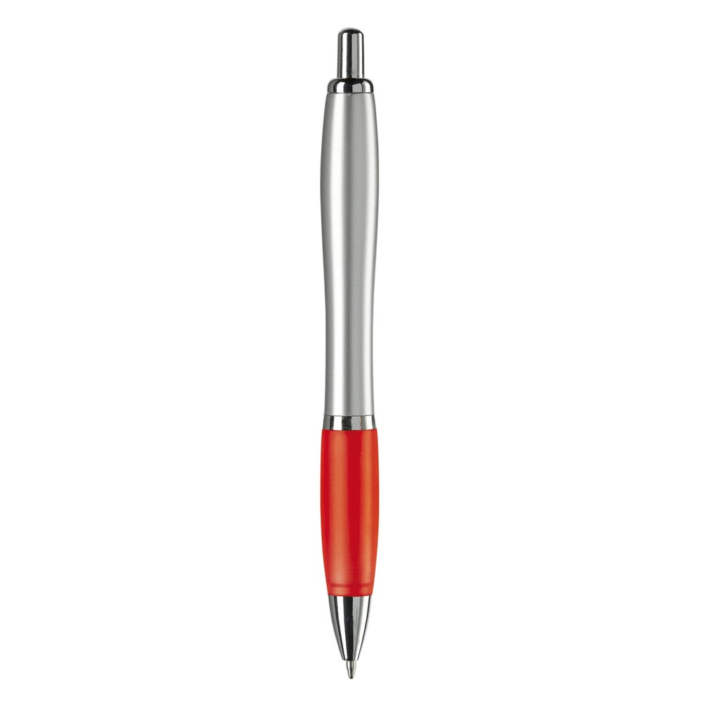 Zilveren balpen met metalen clip, gekleurde grip en een 'metal-look' drukknop, ring en punt. De pen bevat een blauwschrijvende Jumbo vulling.