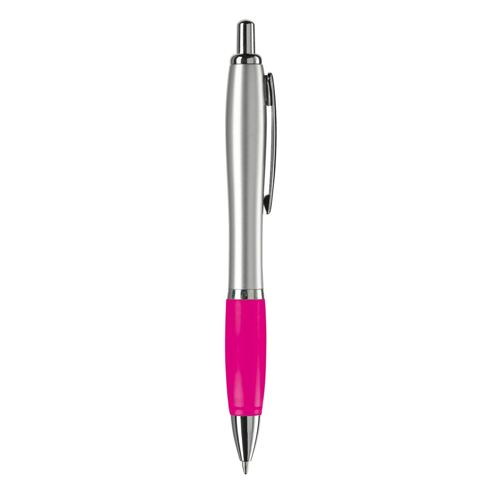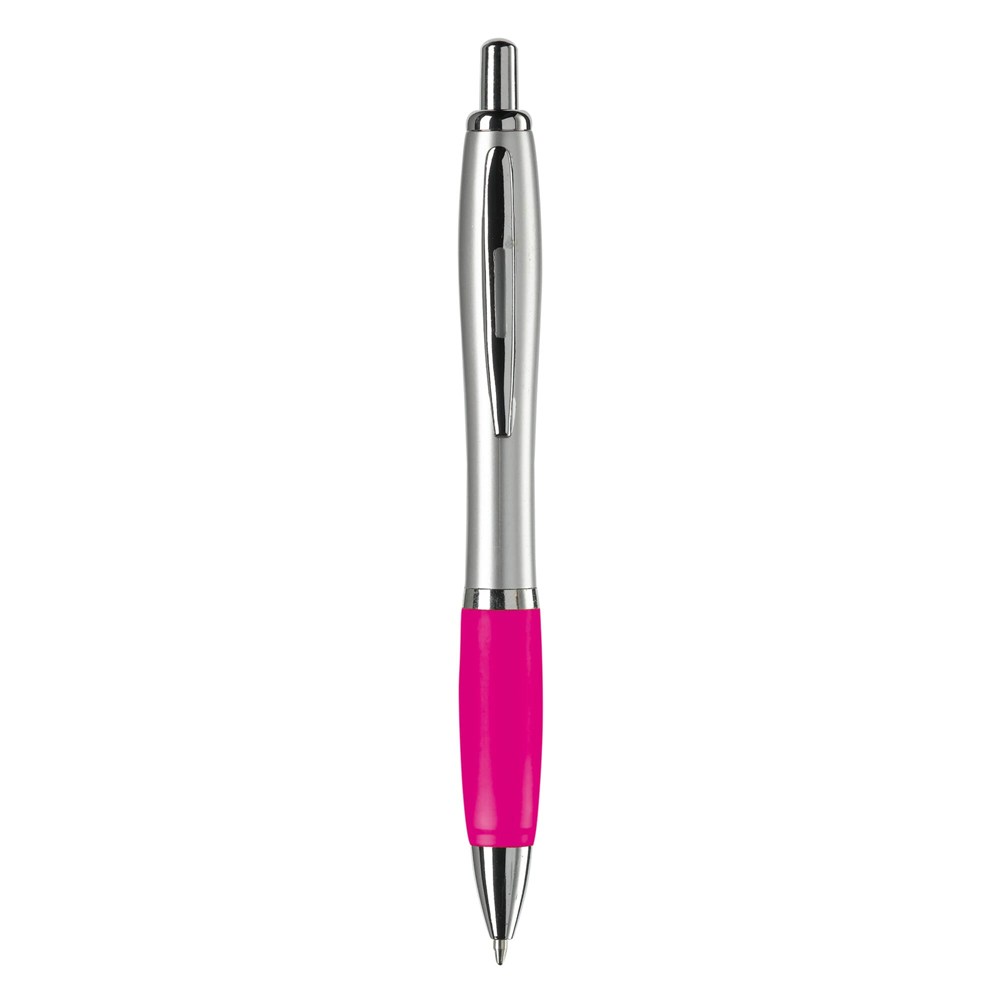 Zilveren balpen met metalen clip, gekleurde grip en een 'metal-look' drukknop, ring en punt. De pen bevat een blauwschrijvende Jumbo vulling.