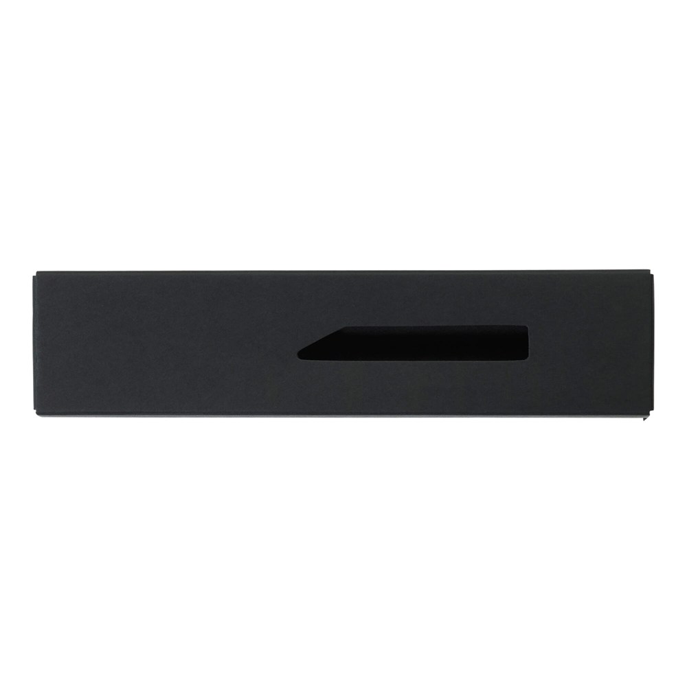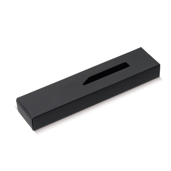 Rechthoekige zwarte kartonnen geschenkverpakking voor één balpen. Met venster en schuifdeksel. Doosje kan bedrukt worden.
