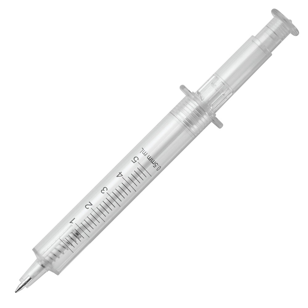 Deze pen in de vorm van een injectiespuit geeft je schrijfvaardigheid een uniek medisch tintje. Verkrijgbaar in meerdere kleuren: rood met rode inkt, blauw met blauwe inkt en transparant met zwarte inkt.