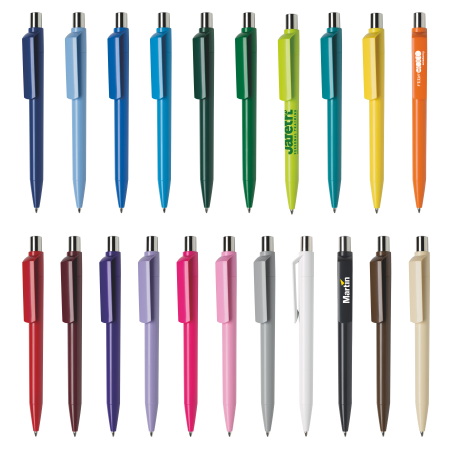 Maxema balpen DOT D1 C CR met glanzend gekleurde houder en clip, glanzend gekleurd element in de verchroomde drukker. Voorzien van Jumbo vulling met blauwe Dokumental inkt voor tot 2.500 meter schrijfplezier. Houders, clips en element in drukker leverbaar in maar liefst 20 kleuren die per onderdeel vanaf 2.000 onderling te combineren zijn