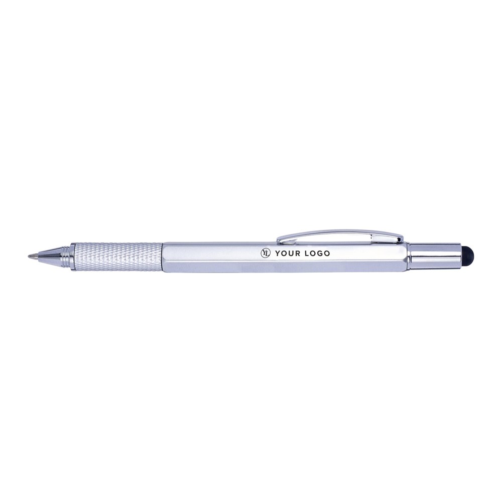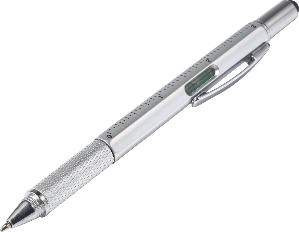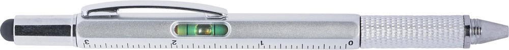 Multifunctionele kunststof balpen met draaimechanisme. Uitgerust met een waterpas, liniaal en rubberen tip voor capacitieve schermen. Draai de rubberen tip los om een verborgen schroevendraaier te onthullen. Zwartschrijvend.