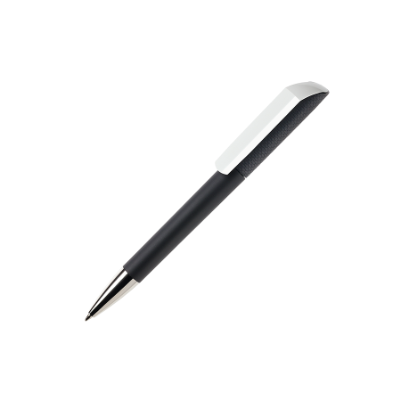 Maxema balpen FLOW F1 GOM CB CR, draaibalpen met gekleurde houder voorzien van rubber coating, glanzende witte clip, mat gekleurd kunststof bovenstuk met opvallend motief, verchroomd puntstuk. Voorzien van Jumbo vulling met blauwe Dokumental inkt voor tot 2.500 meter schrijfplezier. Houder, bovenstuk en clip zijn leverbaar in maar liefst 20 kleuren welke vanaf 2.000 stuks onderling qua kleur gecombineerd kunnen worden.
