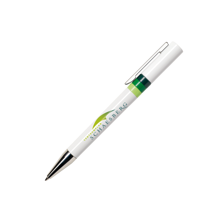 Maxema balpen ETHIC ET900 MULTICOLOUR, draaibalpen met glanzend witte houder en bovenstuk, 3 gekleurden ringen, glanzend gekleurd element in de top van het bovenstuk, verchroomde clip en puntstuk. Voorzien van Jumbo vulling met blauwe Dokumental inkt voor tot 2.500 meter schrijfplezier. De onderdelen van de pen zijn leverbaar in diverse kleuren en zijn vanaf 2.000 stuks onderling qua kleur te combineren.