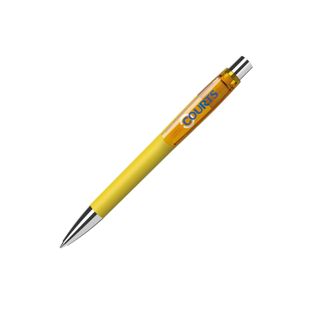 Maxema balpen MOOD MD1 GOM 30 M1 met gekleurde houder voorzien van rubber coating, glanzende gekleurde transparante clip, verchroomd metalen puntstuk en drukker. Voorzien van Parker vulling met blauwe Dokumental inkt voor tot 4.000 meter schrijfplezier. Houders en clips leverbaar in maar liefst 18 kleuren die per onderdeel vanaf 2.000 onderling te combineren zijn