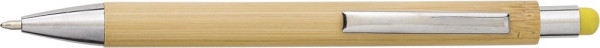 Bamboe balpen met kunststof punt en top, inclusief rubberen punt voor capacitieve schermen. De clip is van metaal. Blauwe inkt.
