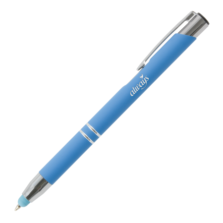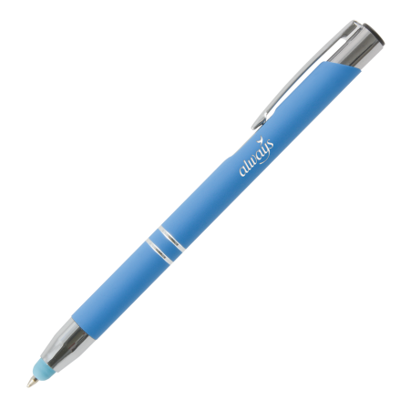 De OBI TOUCH soft touch balpen is een prachtige stylus balpen met een uitstekende prijs-kwaliteitsverhouding, ideaal voor smartphones en tablets. De pen is te personaliseren met lasergravering en verkrijgbaar in 7 levendige kleuren: donkerblauw, lichtblauw, roze, rood, oranje, geel en lichtgroen. Deze balpen is zwartschrijvend.