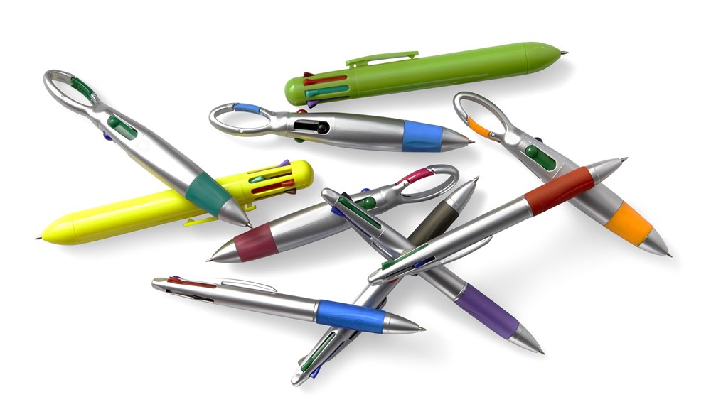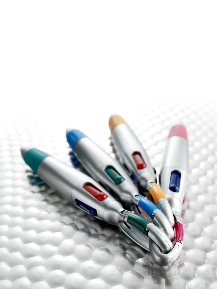 4-in-1 Zilverkleurige kunststof balpen, rood-/blauw-/groen-/zwartschrijvend, met gekleurde rubberen grip en karabijnhaak.
