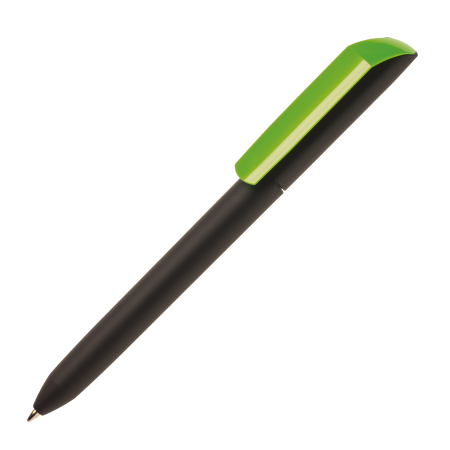 Maxema balpen FLOW PURE F2P GOM KF, draaibalpen met zwarte houder en bovenstuk voorzien van rubber coating, glanzende transparante clip in fluor kleuren. Voorzien van Jumbo vulling met blauwe Dokumental inkt voor tot 2.500 meter schrijfplezier. Leverbaar in maar liefst 5 kleuren welke vanaf 2.000 stuks onderling qua kleur gecombineerd kunnen worden.