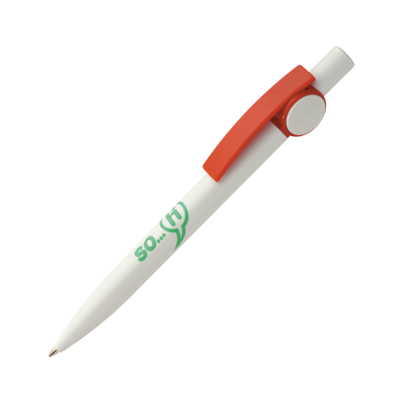 De LOLLAND kunststof balpen Peekay is een witte design promobalpen met een gekleurde, brede en gebogen clip en markante clip-decors. De pen wordt geleverd met een blauw schrijvende Parker systeem langschrijfvulling.