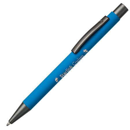De BARBADOS soft touch balpen combineert een aangename grip met een luxe uitstraling door de speciale 'spiegel'-gravering en wordt geleverd met een blauwe vulling.