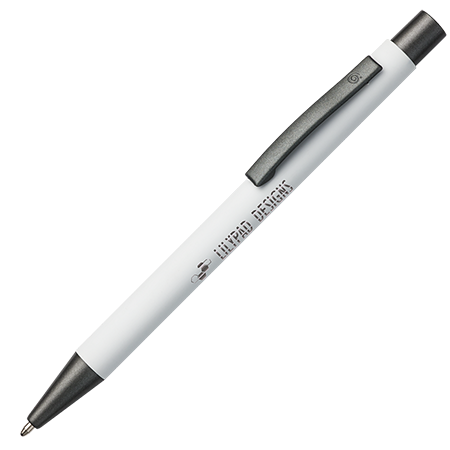 De BARBADOS soft touch balpen combineert een aangename grip met een luxe uitstraling door de speciale 'spiegel'-gravering en wordt geleverd met een blauwe vulling.