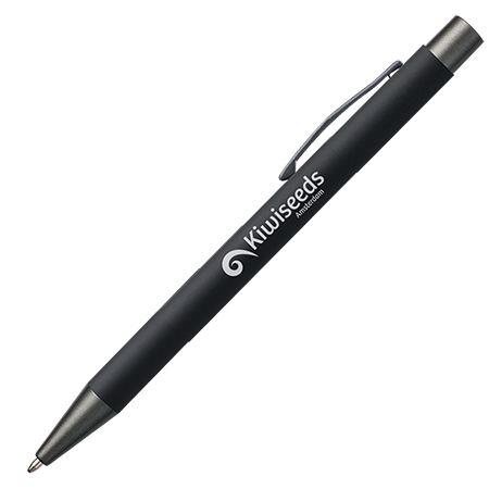 De JAMAICA metalen balpen heeft een stijlvolle rubber finish en is voorzien van antracietkleurige details (drukker, clip en punt). De pen is te personaliseren met lasergravering en is blauwschrijvend.