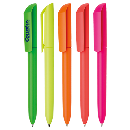 Maxema balpen FLOW PURE F2P MATT F, draaibalpen met matte houder, bovenstuk en clip in fluor kleuren. Voorzien van Jumbo vulling met blauwe Dokumental inkt voor tot 2.500 meter schrijfplezier. Leverbaar in maar liefst 5 kleuren welke vanaf 2.000 stuks onderling qua kleur gecombineerd kunnen worden.