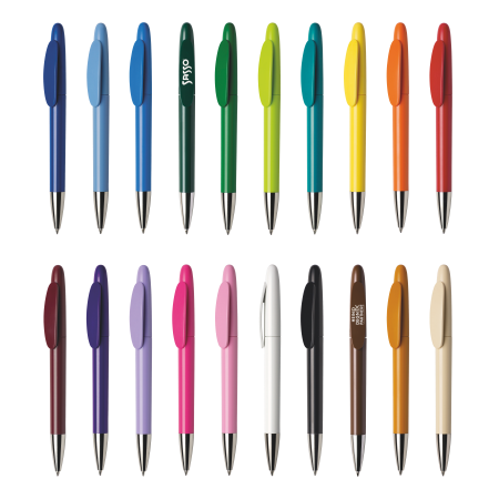 Maxema balpen ICON IC400 C CR, draaibalpen met glanzende gekleurde houder en clip, verchroomd puntstuk. Voorzien van Jumbo vulling met blauwe Dokumental inkt voor tot 2.500 meter schrijfplezier. Boven- en onderstuk van de pen zijn leverbaar in maar liefst 20 kleuren en zijn vanaf 2.000 stuks onderling qua kleur te combineren.